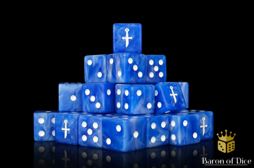 - Sold in sets of 8 dice in their velvet pouch.