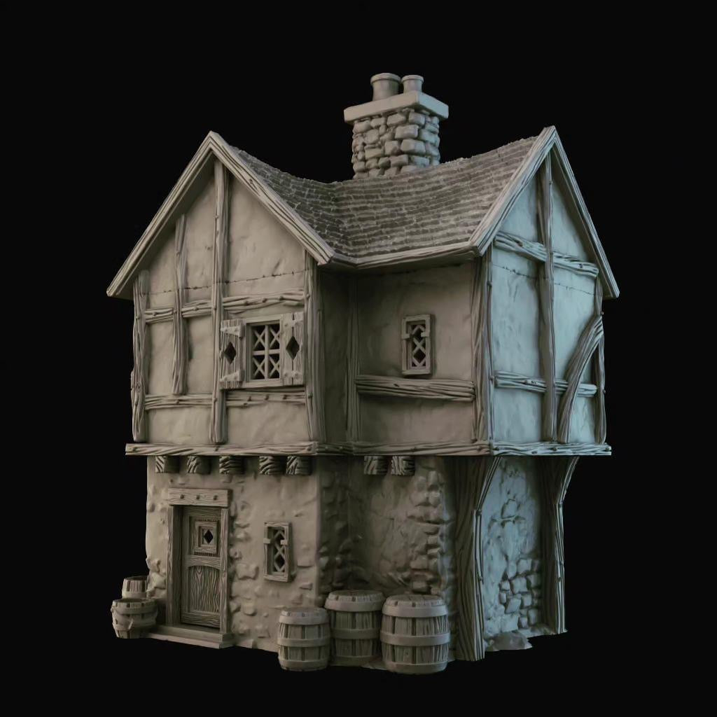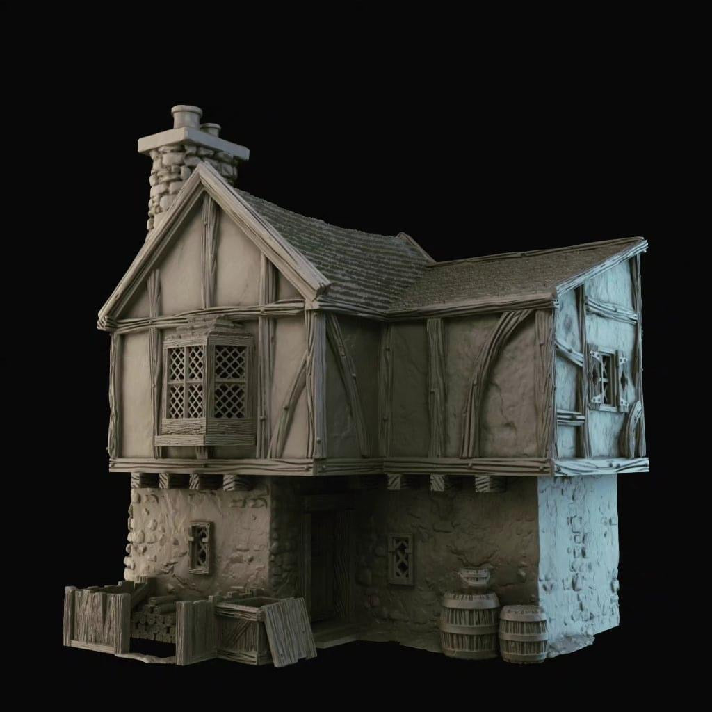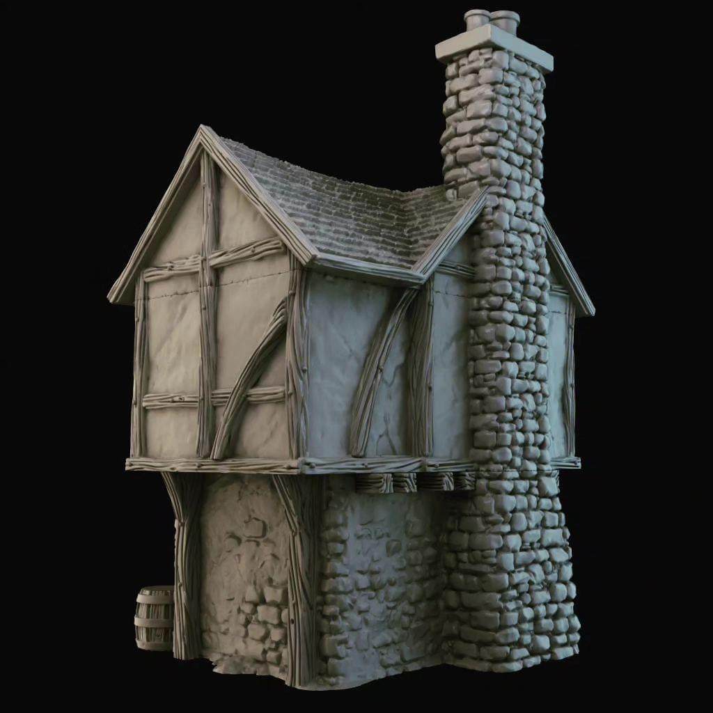 - Mixed printing in PLA plastic with a layer height of 180 µm (buildings and walls), and high-quality resin (8K) for doors and other accessories